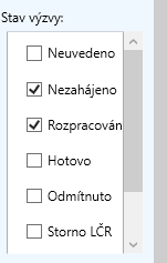 Některé filtry jsou vícestavové. Například v seznamu výzev filtr na stav výzvy. Zaškrtnutím uvedených stavů se načtou všechny výzvy v uvedeném stavu - platí závislost NEBO. Mezi jednotlivými filtry platí závislost A ZÁROVEŇ.