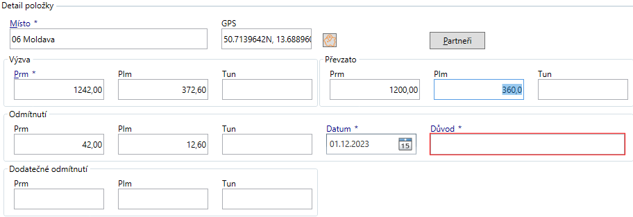 - Zapíše se množství odmítnuté. Z tohoto se dopočítá množství převzaté. Pokud je množství odmítnuté větší než 0, je požadován zápis důvodu odmítnutí.