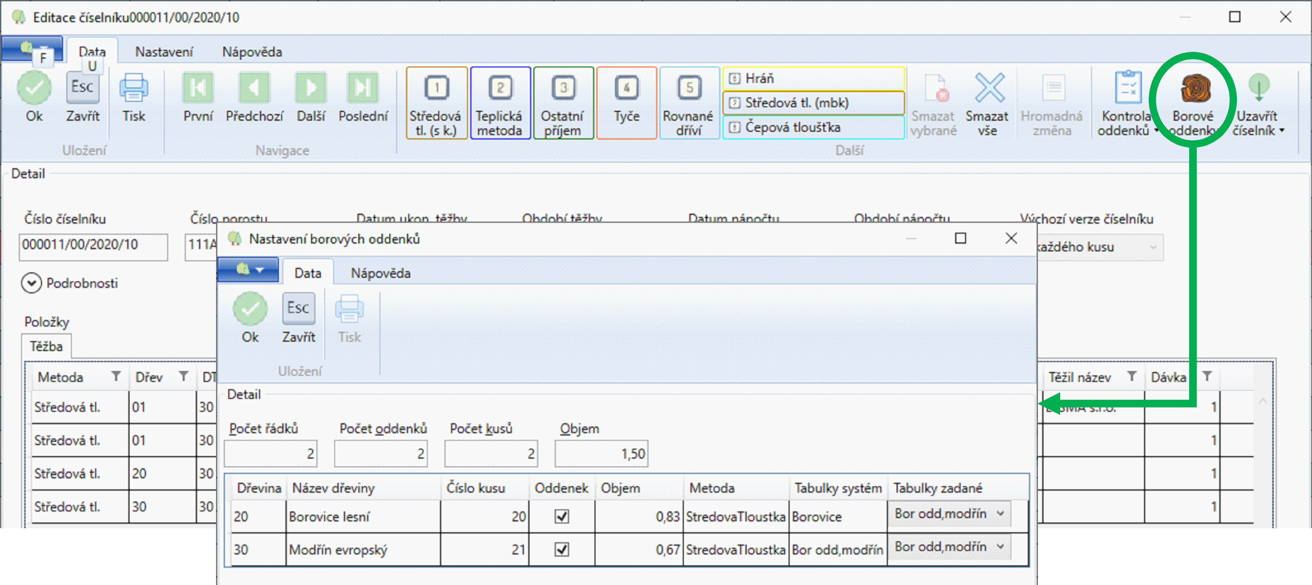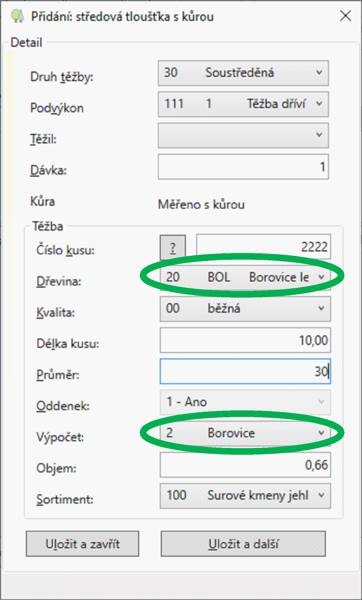 V poli Výpočet lze volit při zadání dřeviny borovice nebo modřínu buď 2 nebo 3. Po uložení položek je možno provést kontrolu zadaného výpočtu (tabulky).
