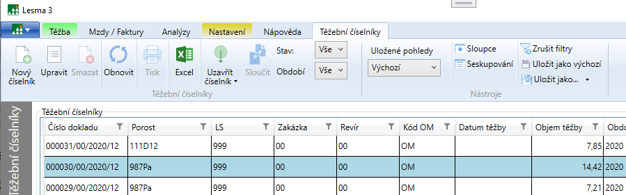 V seznamu číselníků jsou všechny doklady vystavené na příjem dřeva. Každý číselník má v seznamu jeden řádek.