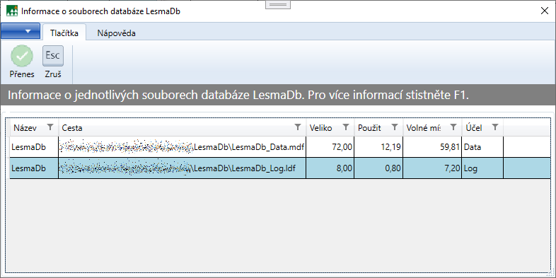 Informace o souborech databáze