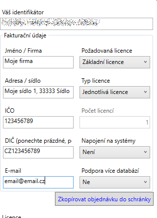 Od nás obdržíte zpět email s souborem obsahujícím licenční informace. Obsah tohoto souboru vložíte sem do pole Licence. Po stisku tlačítka Aktivovat a po ukončení a spuštění aplikace je licence aktivována.