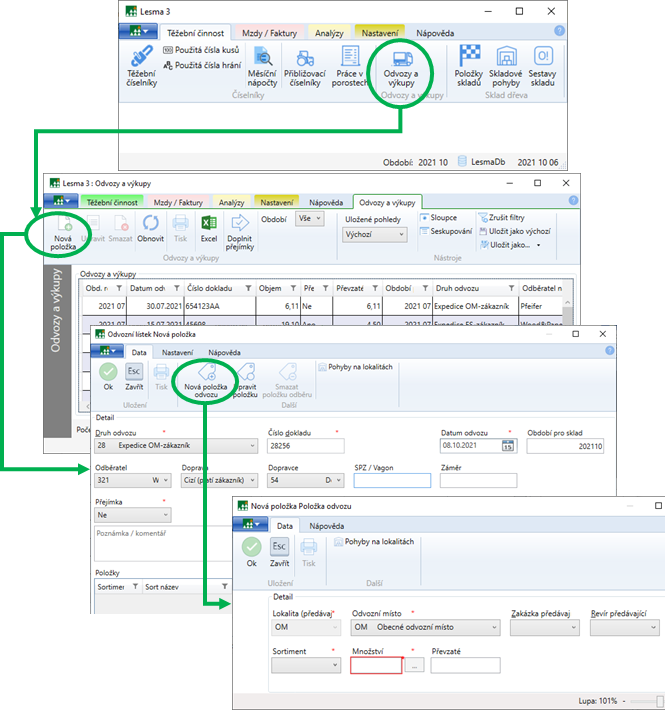 V případě, že se vykoupené dřevo veze beze změny od dodavatele k zákazníkovi, zvolí se druh odvozu Výkup na OM s odvozem. V evidenci zůstává identifikace množství dodávek k dodavateli i odběrateli.