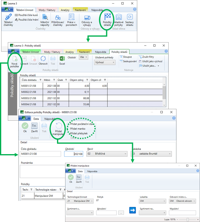 Pohyby skladu lze sledovat detailně i souhrnně v měsíčních sestavách pohybu skladu nebo Skladových pohybech