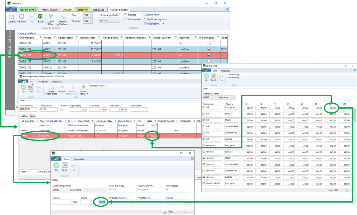 Pracnost zadání sazeb na těžbu a přiblížení výrazně snížíte přednastavením sazeb. Přednastavení sazeb za práce, popřípadě příplatků k sazbám, se provádí v nastavení vstupů u obchodních partnerů.