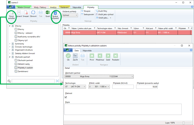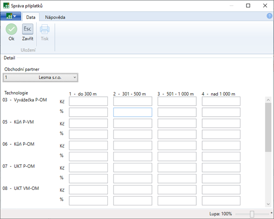 Příplatky k sazbám lze přednastavit hromadně k přibližovacím technologiím vzhledem k přibližovacím vzdálenostem.