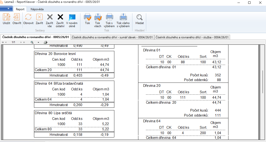 Aktivní reporty jsou otevřeny v jednotlivých záložkách. Reporty je možné uložit do archivního formátu VSP a později znovu otevřít, do standardního formátu PDF je možné tisknout přes standardní souborovou tiskárnu například Microsoft Print To Pdf nebo i jiné.