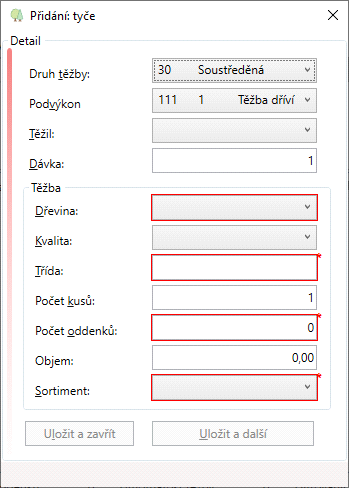 - Dřevina. Výběr dřeviny ze seznamu (Nastavení dřevin) nebo zápis čísla dřeviny.
