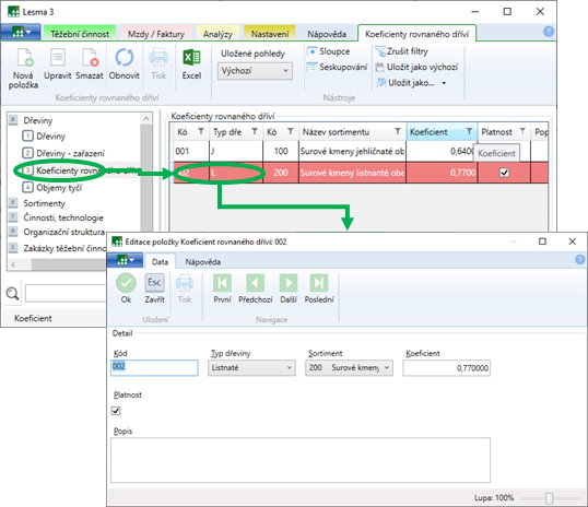 V programu jsou přednastaveny základní koeficienty pro přepočet rovnaného dříví z prm na m3 pro listnaté a jehličnaté sortimenty. Podle potřeby lze přidávat.