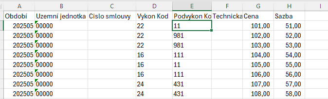 - Kód podvýkonu - identifikace podvýkonu kódem. Kombinace Výkon/podvýkon musí existovat.